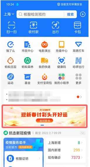 1、打开手机上的支付宝app,在首页点击横幅即可进入讨彩头活动中;