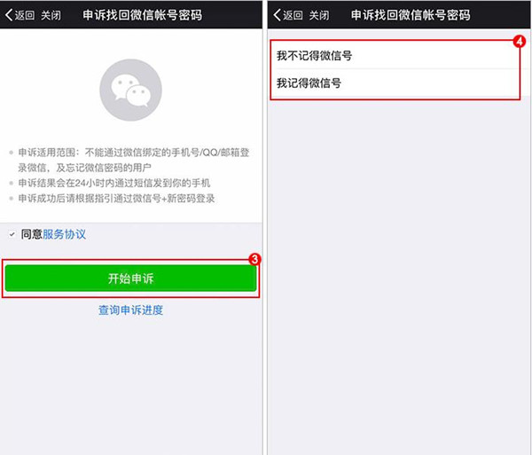 3、点击【开始申诉】,选择自己是否记得微信号后,填写申诉材料即可完成申诉。