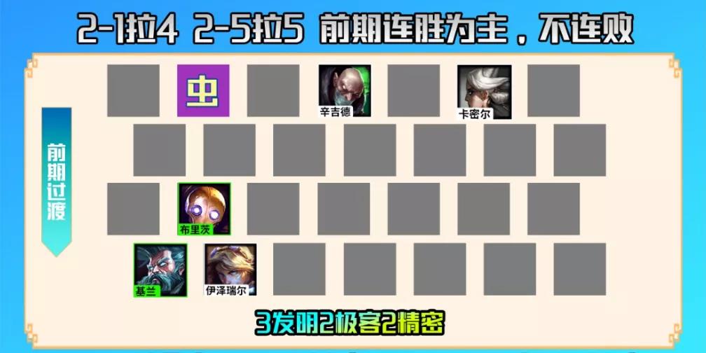 前期阵容:前期阵容围绕3发明家羁绊搭建阵容,5人口凑出3发明明2极客2精密即可,装备尽量前期直接给,一般不建议留3个散件,前期打工装备可以直接做出羊刀给EZ打工、狂徒、鬼书给卡密尔。