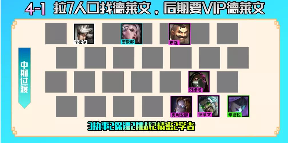 中期阵容:3-2拉6人口,4-1拉7人口小D20-30金币,主要找到1只德莱文过渡一下中期。但是一定要凑出3执事2保镖2挑战羁绊,德莱文没有找到2星也没有关系,一般8人口出德莱文的VIP几率会大幅度提升。而且阵容一定要开3执事,虽然执事羁绊加成不多,但是能够提高VIP出现概率,这是至关重要。