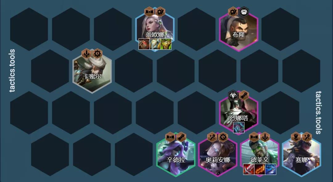 阵容组成:卡密尔、辛德拉、蕾欧娜、赛娜、德莱文、布隆、烈娜塔、奥利安娜