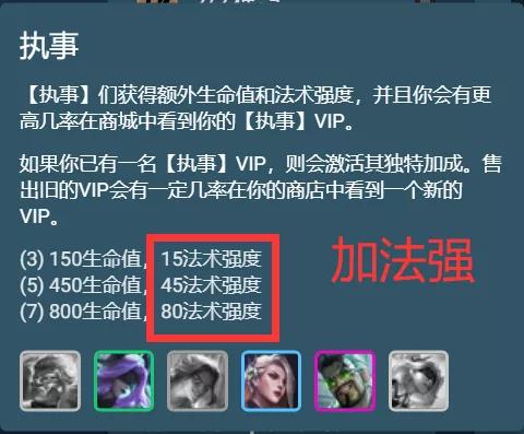 执事羁绊的效果是增加生命值和法术强度,但是这里注意的是VIP不增加物理攻击力,不增加攻击力但是增加生命值对于德莱文基本来说没有用,因此我们只需要3执事来激活德莱文VIP,VIP执事的特殊加成是我们这套阵容的核心必备。