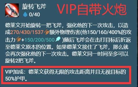而VIP德莱文能够获得无限攻击距离,能够站在最后一排角落里面无限攻击,其次伤害能够造成无视目标的百分比护甲,基本相当于一个火炮+破甲弓。因此不推荐没有VIP的德莱文玩这套阵容。