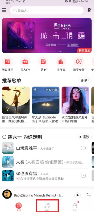 1、打开网易云音乐,然后进入到其首页中,在此点击下方导航栏中的【我的】进入到该界面;