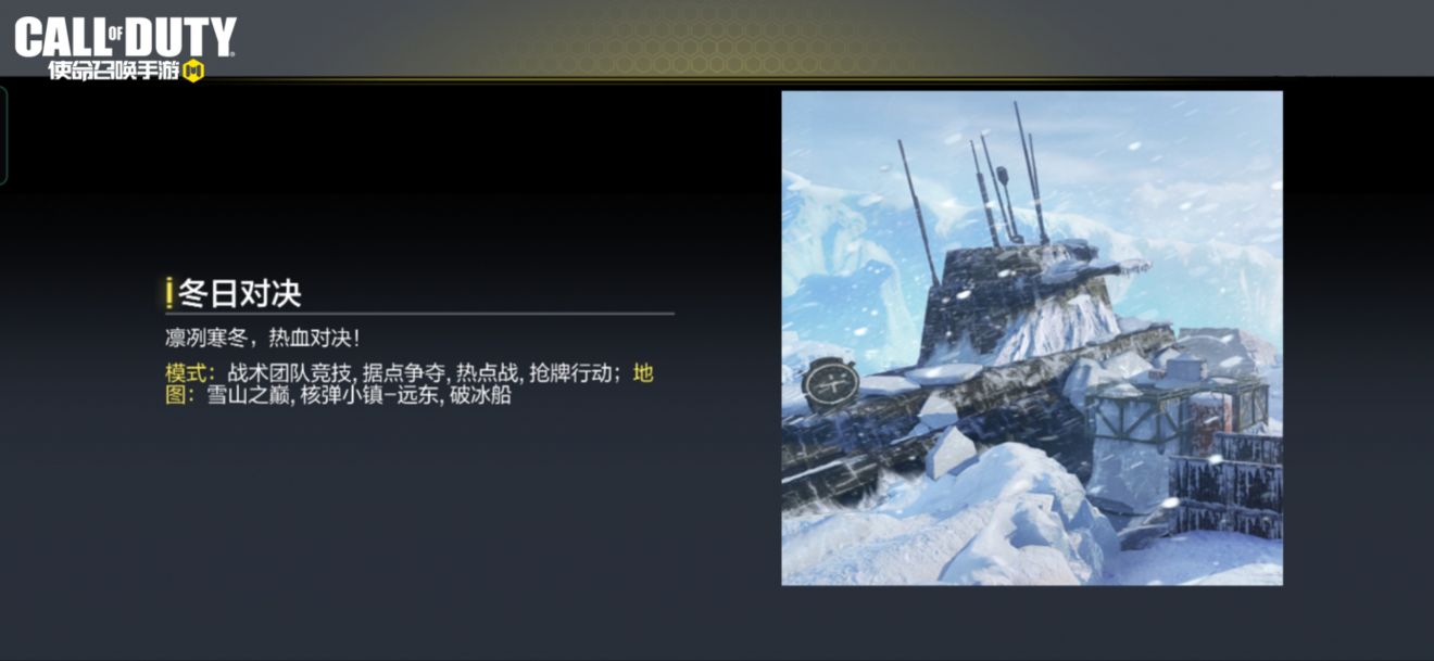 2月18日,全新地图赛单:冬日对决即将上线多人对战模式,其中收录了冬日氛围感满满的雪山之巅、核弹小镇-远东、破冰船三张地图,支持战术团队竞技、据点争夺、热点战及抢牌行动四个模式。凛冽寒冬,不如来一场激烈的热血对决吧!