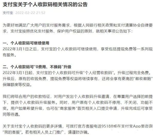 2022年3月1日之后,支付宝的个人收款码可继续使用,也可继续享受现有的包括提现免费在内的一系列服务。