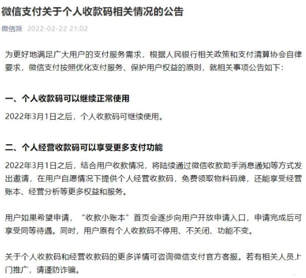 随后,微信支付发布了关于个人收款码相关情况的公告,表示2022年3月1日之后,个人收款码可继续使用。