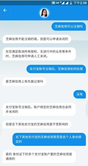 同时,我关注到了支付宝里绑定的芝麻信用能否注销的问题。经过向客服咨询得知,芝麻信用可申请人工关闭,而用户将个人支付宝账号注销后,账户绑定的芝麻信用也会同步关闭,但是由于开通支付宝会和个人身份信息绑定,所以同一身份证下的多个支付宝账户里的芝麻信用是通用的。