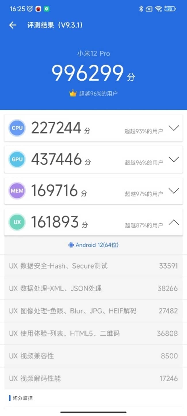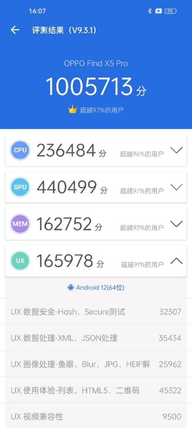 游戏开始前,依照惯例,先来跑个分,可以看到,在安兔兔V9.3.1版本中,OPPO Find X5 Pro得分为1005713分,小米为996299分,二者的GPU得分在44万左右,对比骁龙888 Plus安兔兔GPU 32W左右的得分,足见这次全新一代骁龙8移动平台在GPU上的巨大提升,对游戏党们而言无疑是一件好事。