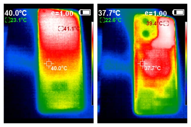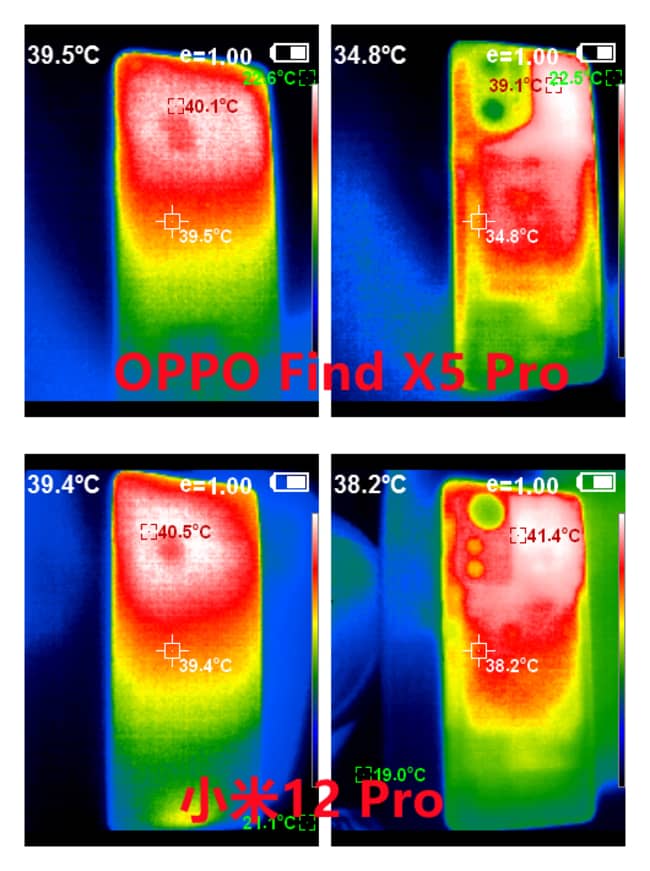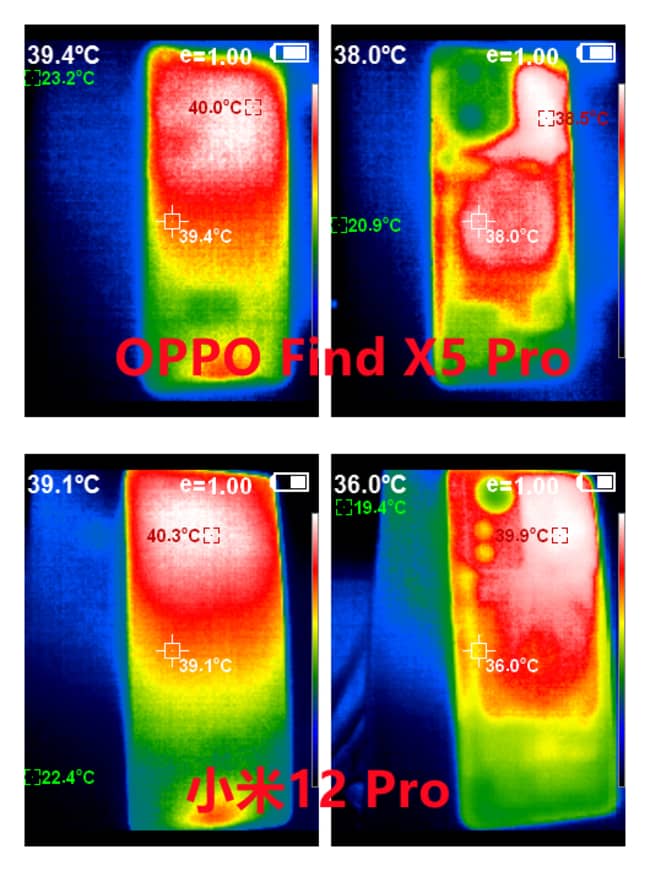 小米12 Pro的表现也不错,平均帧率为108.33帧,只不过从帧率曲线上能看到, 30分钟后,在团战场景下,帧率会频繁掉到90帧,脱离团战后会重新回归120帧。从机身温度上来看,运行1小时120帧模式《王者荣耀》,OPPO Find X5 Pro的正面最高温度为40°C,背面为38.5°C。小米12 Pro为40.3°C,背面为39.9°C。