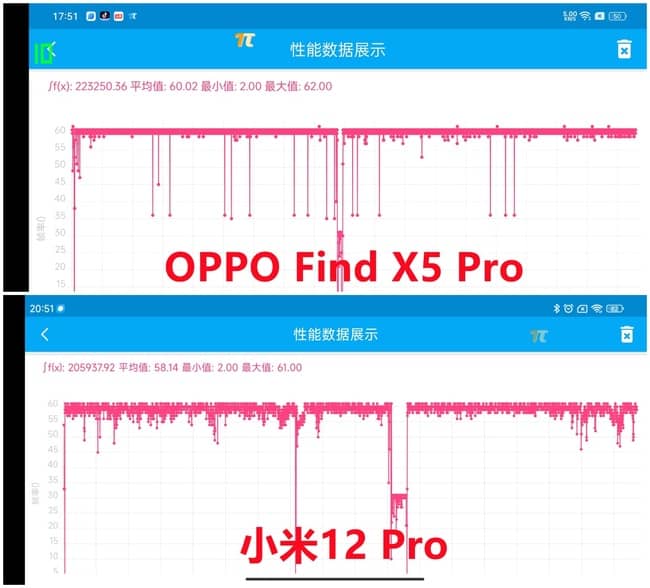 接下来是《和平精英》,将画面设置为HDR高清,帧率调整至极限,OPPO Find X5 Pro的平均帧率为60.02帧。开启后O-sync超频响应功能后,可以大幅降低全链路响应延迟,提升操作速度。小米12 Pro则支持十指480Hz超高触控响应,一小时游戏后,平均帧率稳定在58.14帧。最终,OPPO Find X5 Pro的机身正面最高温度为40.1°C,背面最高温度为39.1°C。小米12 Pro机身正面最高温度为40.5°C,背面温度为41.4°C。