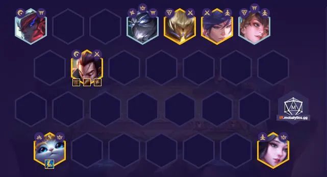 队伍副核心猫咪,无脑硬叠大天使,有多少上多少,亚索、永恩后期吸血续航强,加上猫咪更加能拖,后期回血一口,攻速直冲上限,能追三星再补一件复活甲,加容错防翻车。