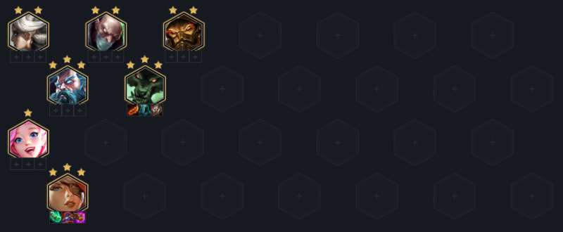 顺利的话,狼人奎因双双到三之后即可直接上八,搜出杰斯代替萨勒芬妮,可以多挂一个卑鄙之钩机器人,也可以出塔姆去和狼人一起揍对面前排,看羁绊可以开5发明、5炼金、6挑战或是4精密都是可以的。