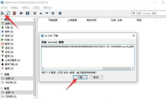 然后,打开qBittorrent客户端创建下载任务,在弹窗中粘贴链接,开始下载。