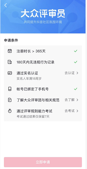 参加大众评审团的用户需要是绑定了手机号的用户,需要年满18周岁,注册时长超过一年,180天内无违规行为记录,并且需要通过评审规则能力考试。