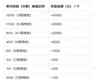 为鼓励质量优质且抖音用户喜爱的特效,平台将特效分为8个级别,当特效的单日投稿峰值(次数)达到以下标准时,对应奖励如下: