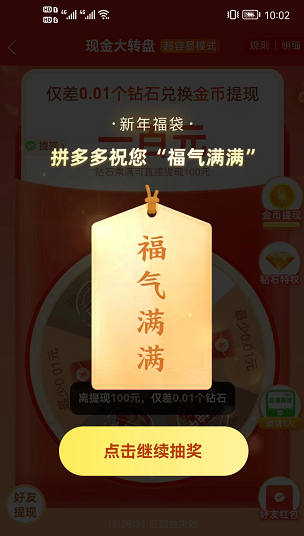 拼多多到最后一步0.01钻石,就出现福气满满,至少又让六七十人助力,结果还是不成功,一直显示快了,而且查不到助力产生福气满满的数据,很坑,就是不断的找人来拼多多,但是0.01就是拿不到,欺骗!福气满满的数量也不公开,还有几个也不公开,就是无底线的助力。