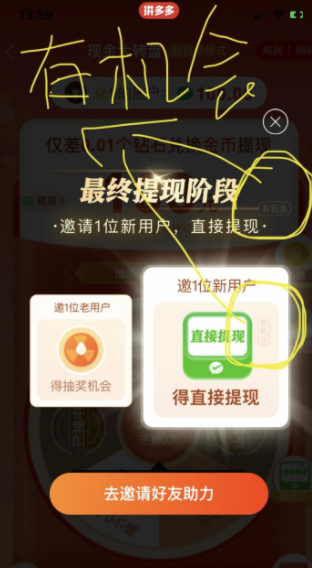 大家帮忙点了一个助力红包看到马上提现是不是很动心,然后你也会去点,邀请无数好友。从0.5到0.1到0.05金币,然后变成0.1宝石。在你狠下心去面对0.01宝石提现的时候欢迎你进入俄罗斯套娃世界。接下来你会面对的是邀请20人以内成功(百分之零点几概率)和邀请几百人显示的还是祝你福气满满,看到这话的时候老子就有一种老子没福气拿不到钱要你祝我的感觉。但是面对0.01谁不心动啊?开始另辟蹊径。邀请新用户花钱买刀…………花了大把的钱都不成功。拼多多官方说邀请新用户也是有几率不是百分百成功。所以我研究了半天他这个广告,发现了这样一行小字