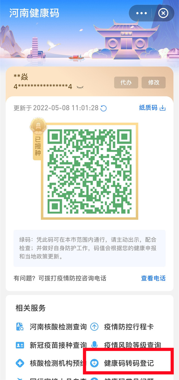 省外入豫黄码人员也可以打开支付宝→河南省健康码→健康码转码登记。