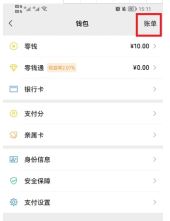 4、在钱包中,点击其中右上角的【账单】进入到账单界面;