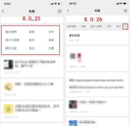 在iOS微信8.0.26正式版中,微信的收藏页面中,顶部的分类菜单进行了优化,之前是平铺的九宫格样式,现在折叠成了一行,点击最右侧的箭头即可展开全部分类。