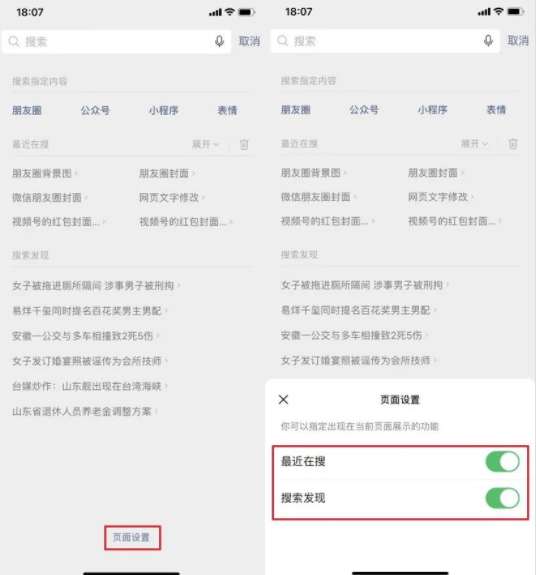 与安卓微信一样,本次iOS微信8.0.26正式版中,也对搜索功能进行了优化,点击微信主页顶部的搜索框,在搜索的页面底部新增“页面设置”,可以指定出现在当前页面展示的功能,分别是最近搜索和搜索发现。