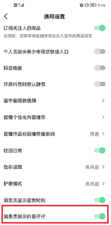 4、在该功能界面中,就可以点击关闭【消息页展示抖音仔仔】功能按钮,就可以完成关闭设置。