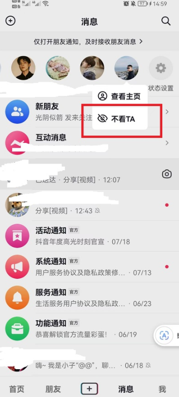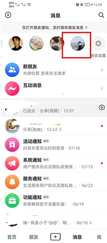 大家可以看看这篇文章,去秀小编给大家带来的抖音消息上面一排人关掉方法介绍,请关注去秀手游网以获取第一时间的资讯更新信息。