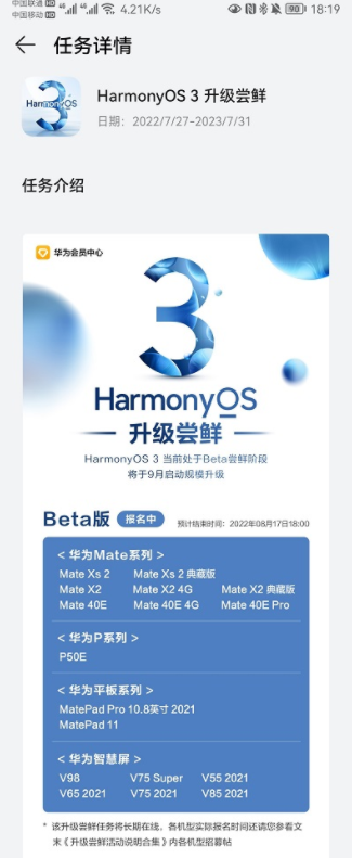 华为方面宣布多款机型开启 Beta 版尝鲜招募,截止 8 月 17 日 18:00,本次招募用户预计 8 月中下旬推送新版本,对于首批以外的用户,华为也将会依据版本进度逐步分批审核,并为收到“审核通过”通知的用户陆续推送版本。