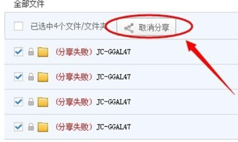 2、可以看到刚才分享的文件和文件夹名称前面有红色的文字提示:分享失败。其原因应该是由于文件含有违反国家限制规定、百度云盘文件规定、或者是敏感性的词语。记住自己分享的文件名称,然后点击分享失败文件前面的复选框打勾,然后点击上方的【取消分享】按钮。