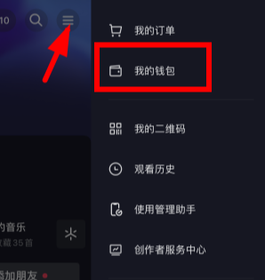 1、打开抖音,点击我,点击右上角三横,点击钱包。