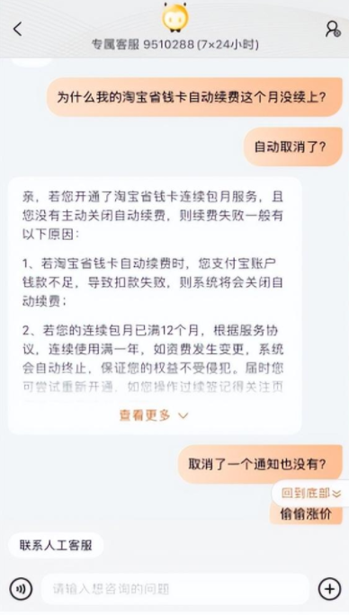 在网上搜了一圈才发现这种情况不止一个,早在今年年初就有很多人投诉淘宝省钱卡涨价、自动解约。还有人的淘宝省钱卡入口不见,入口直接给关了。
