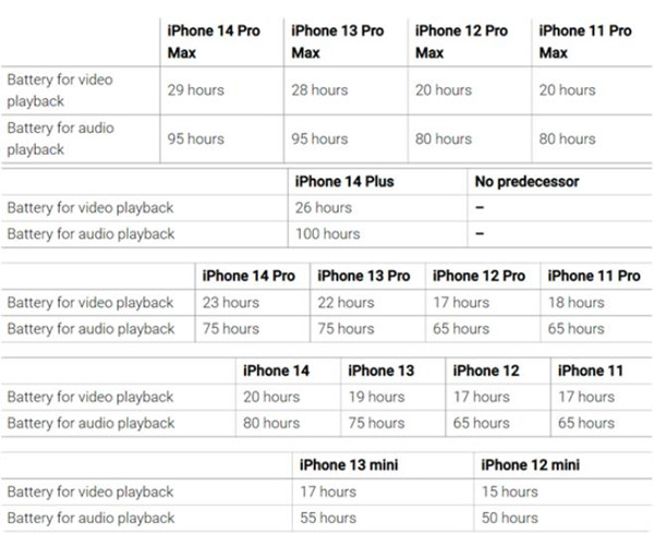 iPhone 14 Pro Max中,音乐续航时间也没变,视频续航提升了1个小时,比iPhone 11/12代增加了9个小时。