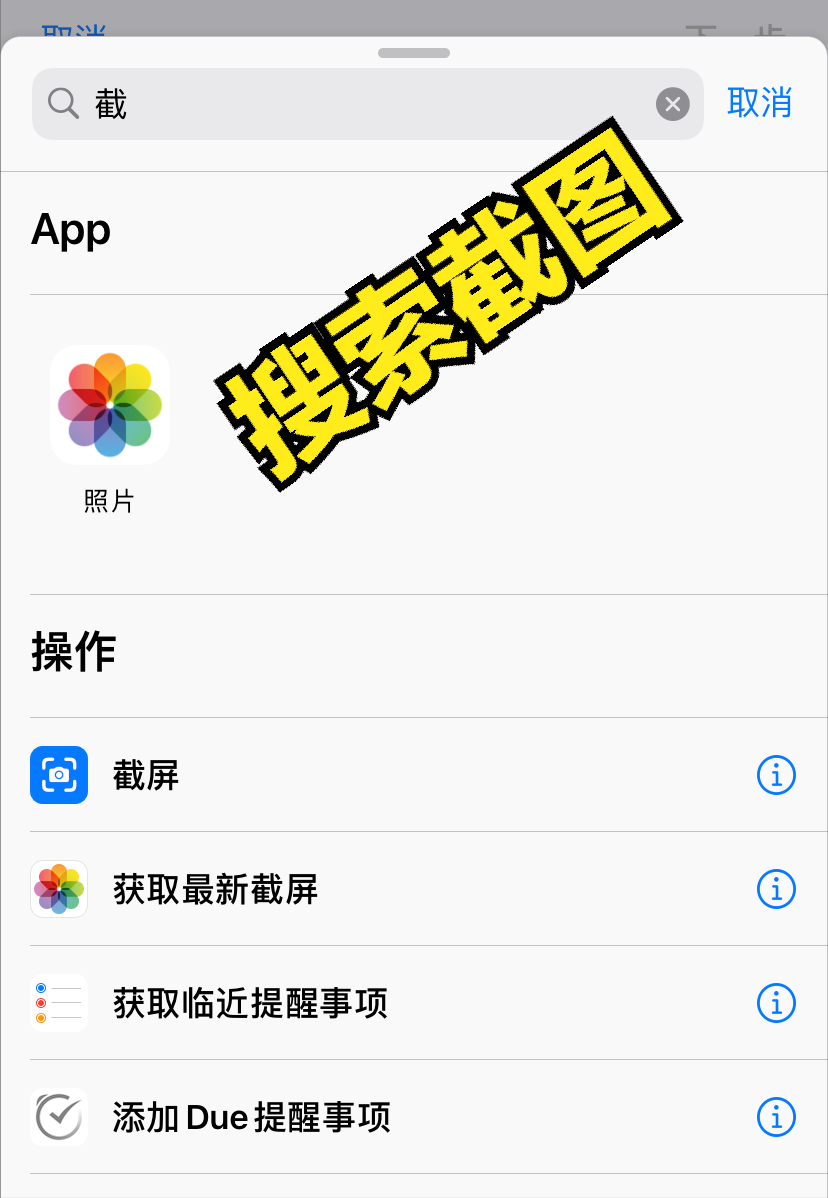 点击添加操作,在弹出页面搜索截屏,点击“获取最新截屏”