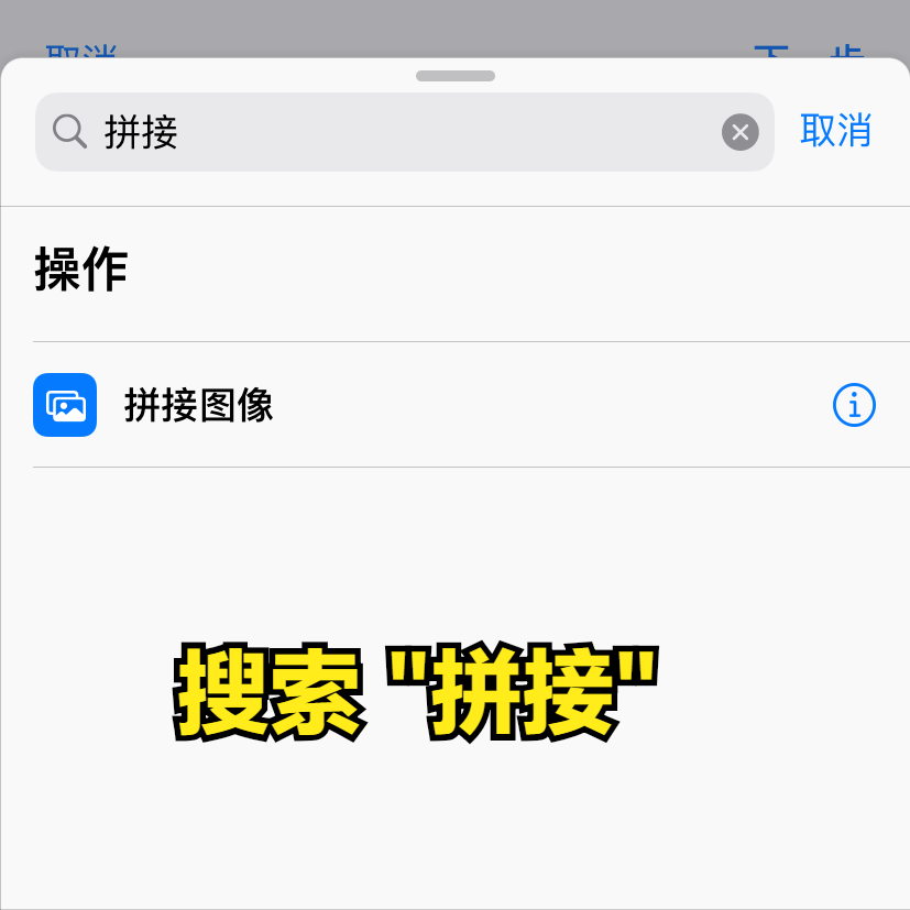 完成后,继续点击下方 + 号,在弹出的搜索框中搜索 “拼接”,并选择 “拼接图片”