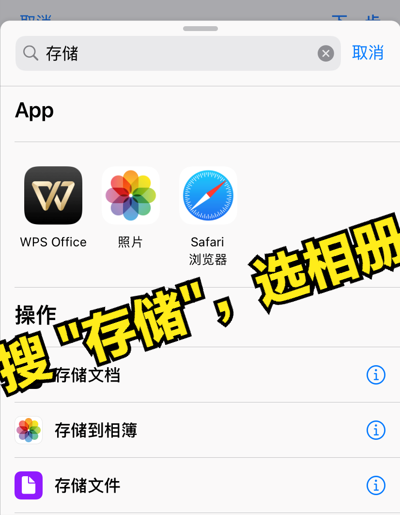 完成后,继续点击下方+号,在弹出的搜索框中搜索 “存储”,并选择 “存储到相簿”