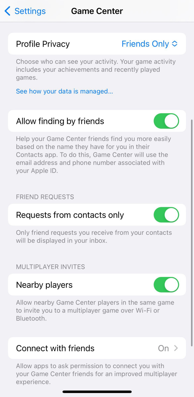 “设置”>“游戏中心”中的“允许好友查找”的新选项。