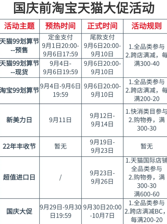 国庆大促BC再次拉通,跨店满减每满200-20,力度上来看,天猫99划算节的优惠比较大,每满300-40。