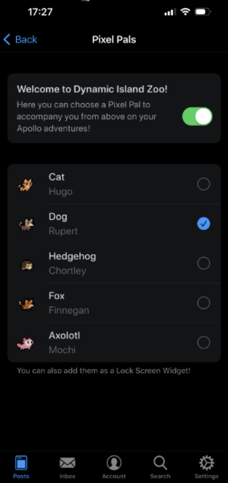 国外有开发者出了新app Apollo,实现了有趣小功能——灵动岛“电子宠物”。可以灵动岛养“宠物”打砖块,可以选择猫、狗、刺猬、狐狸等,它会在动态岛周围徒步,国内很多小伙伴表示很羡慕,
