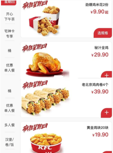 疯狂星期四可以在KFC app点外卖,也可以在微信小程序里面关注KFC后,在里面点。也可以直接用他们的宅急送配送,我关注了一下,KFC的疯狂星期四的外送价格跟去店里的价格是一样的,不像其他的产品。