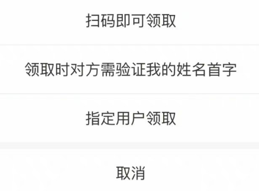 其中,设置的领取等方式包括扫码领取、领取时对方需验证姓名首字、指定用户领取等。