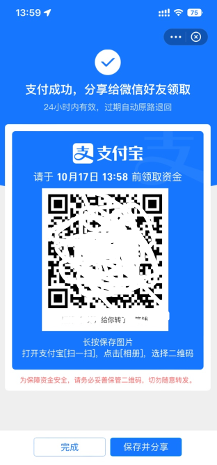 4,输入密码之后,就会出现一个一个二维码,大家将图片保存到相册,然后通过微信/QQ/微博/钉钉等渠道发给需要转账的对象,然后微信/QQ好友可以使用支付宝App扫码领取,对方领取时系统自动通知,超过24小时未领取会自动退回。