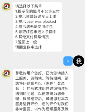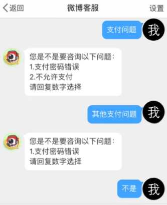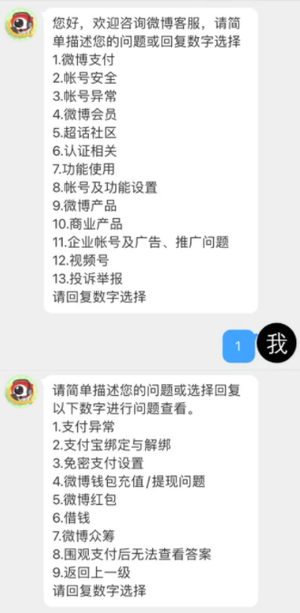 第三步:找到人工客服搜索“微博客服”点进聊天对话框,这里需要注意的是,普通微博用户是无法直接接入人工客服的,你需要一些小技巧调出人工客服,诀窍就是要和“钱”相关。下面附上我调出人工客服的过程,可能现在流程稍有变化,但记住主旨就是和“支付“问题相关,和机器无法自动解决的“其他”问题相关。