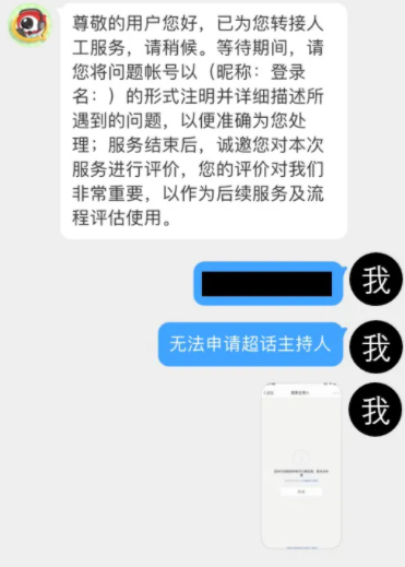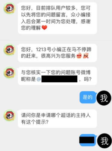 第四步:将截图发送给人工客服拿着第二步中的截图去找人工客服,️ 敲重点!!!只要和客服讲,为什么不能申请超话主持人,记得只提不能申请超话主持人,别提超话发帖不显示的问题!!!