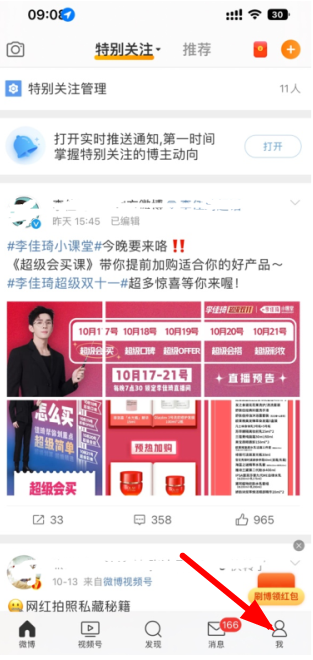 博超话发帖怎么不显示在主页?打开微博首页,点击底部导航栏“我”。