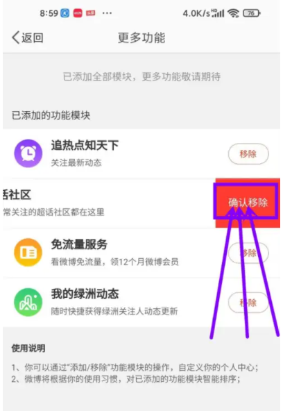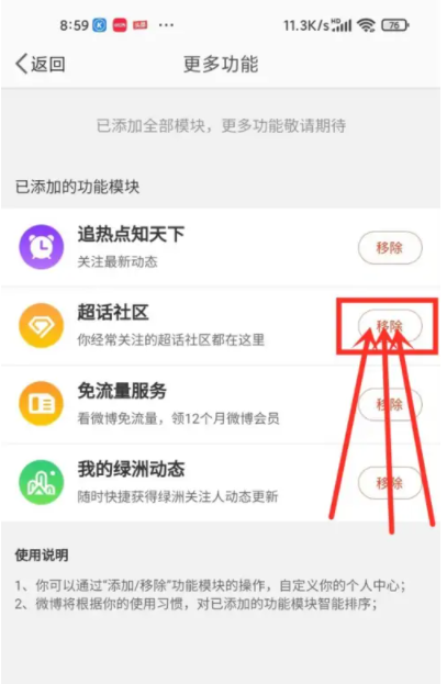 点击“确认移除”,即可设置微博超话不在主页显示。