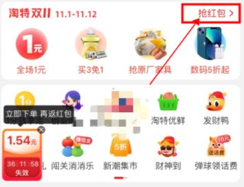 1、打开淘特app,在右下角“我的”界面点击淘特双11后面的“抢红包”。
