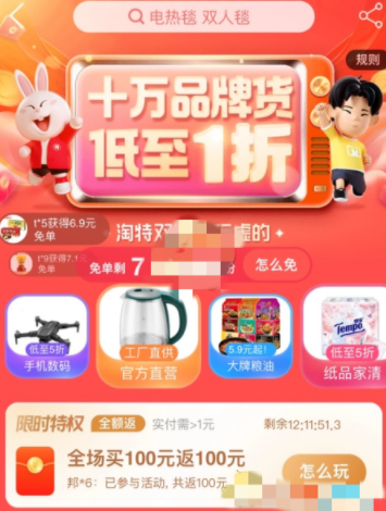 消费者上淘特搜一搜,即可享四大权益:百万份免单,“比价王者”对折,30万份好物0元试用,以及整点领取最高500元的无门槛红包。