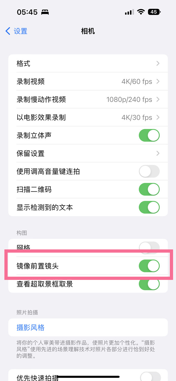 2、关闭【镜像前置镜头】右侧的开关即可。