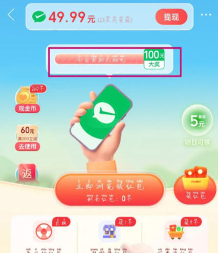 温馨提示:如果底部状态栏没有入口,可在功能图标里找到“每日摇红包”进入。